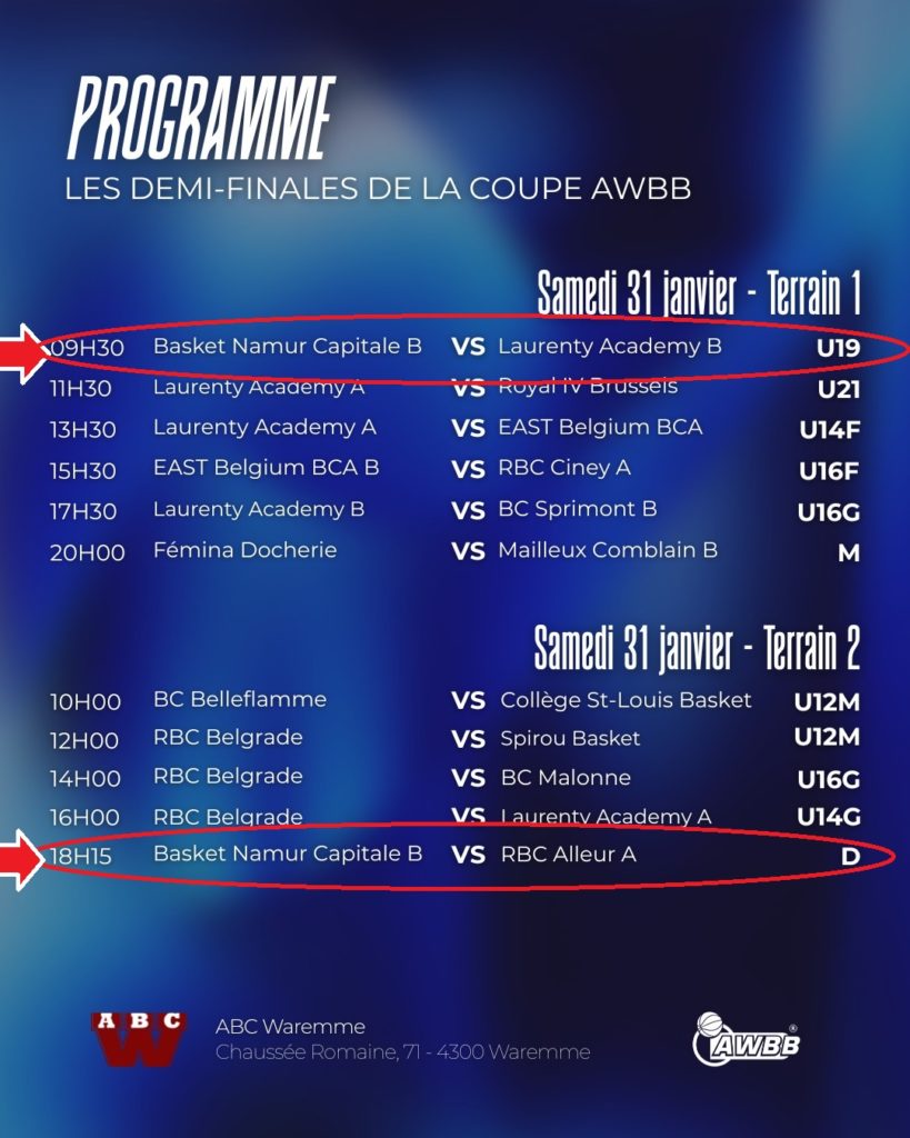 > 09h30 : U19 BASKET NAMUR CAPITALE – LAURENTY ACADEMY