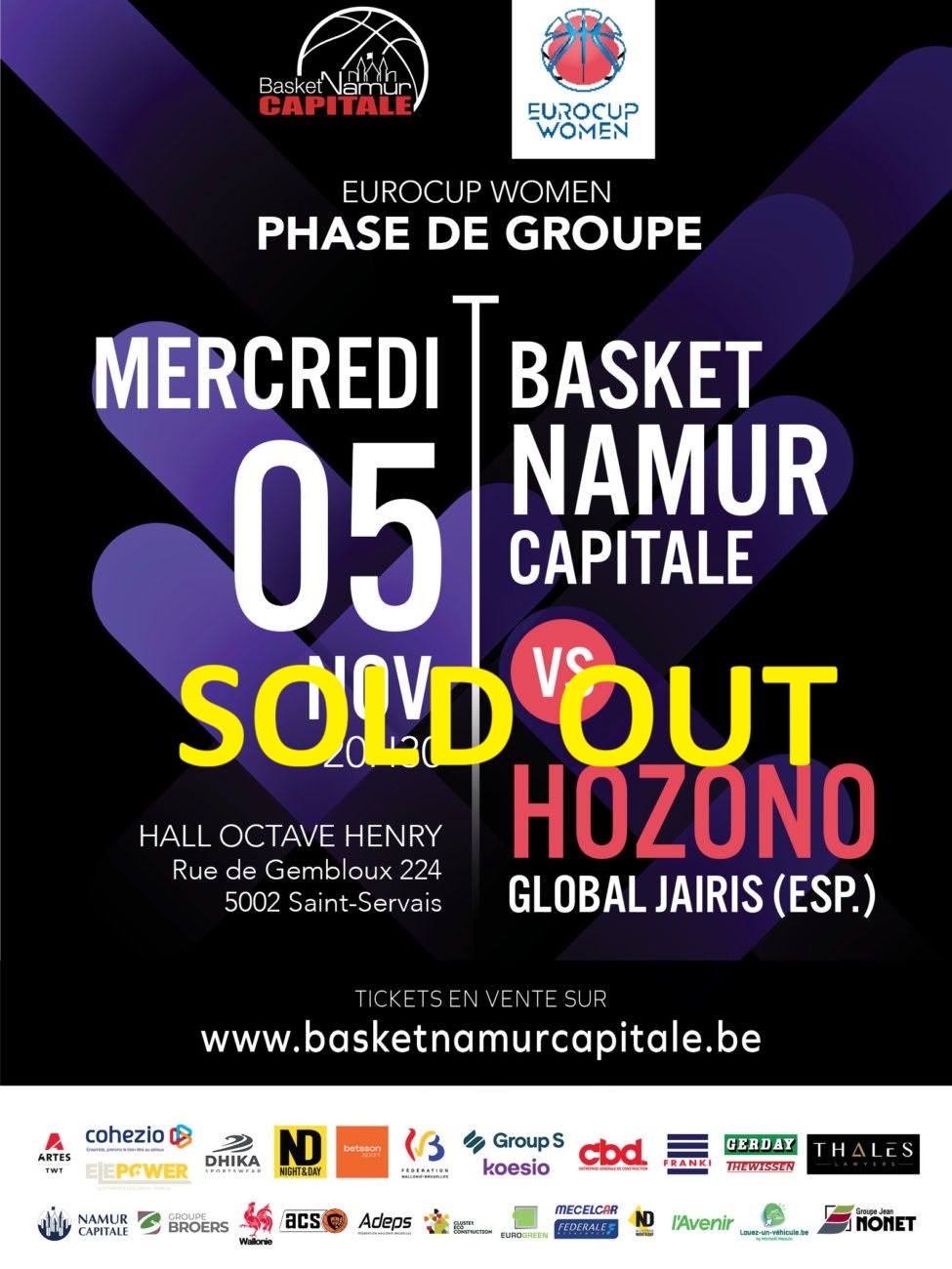 5Nov SOLD -OUT !!! EUROCUP : NAMUR CAPITALE – HOZONO GLOBAL JAIRIS (Espagne) 3 novembre 2025Evènements , News Mercredi 5 Novembre Match EUROCUP BASKET NAMUR CAPITALE – HOZONO GLOBAL JAIRIS (Spain) TICKETS : COMPLET Le mercredi 05/11 à 20:30 Hall Octave Henry, Rue de Gembloux, Namur, Belgique