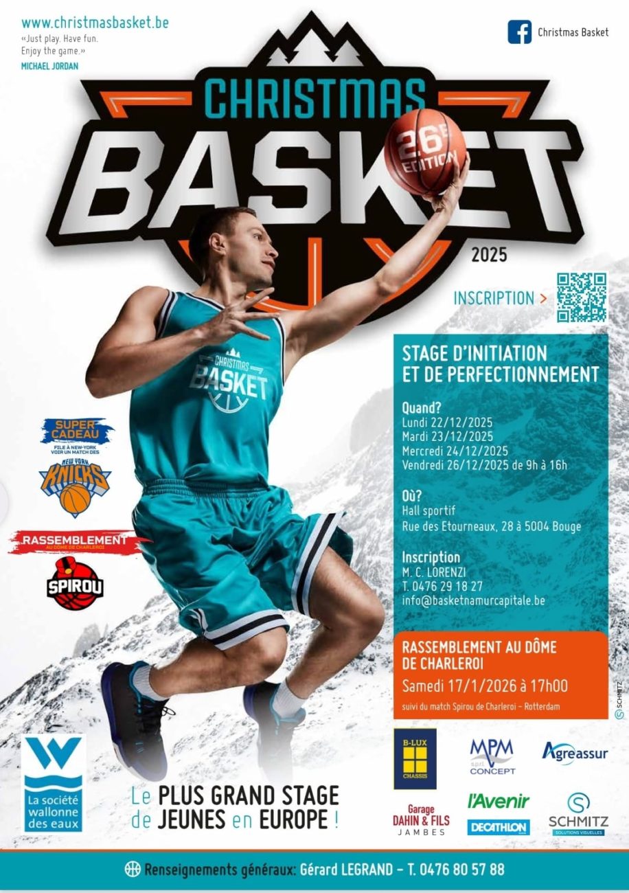 Le Basket Namur Capitale a le plaisir de collaborer au stage Christmas Basket qui se déroulera les 22, 23, 24 et 26 décembre 2025 au Hall sportif de Bouge (rue des étourneaux, 28 à 5004 BOUGE)