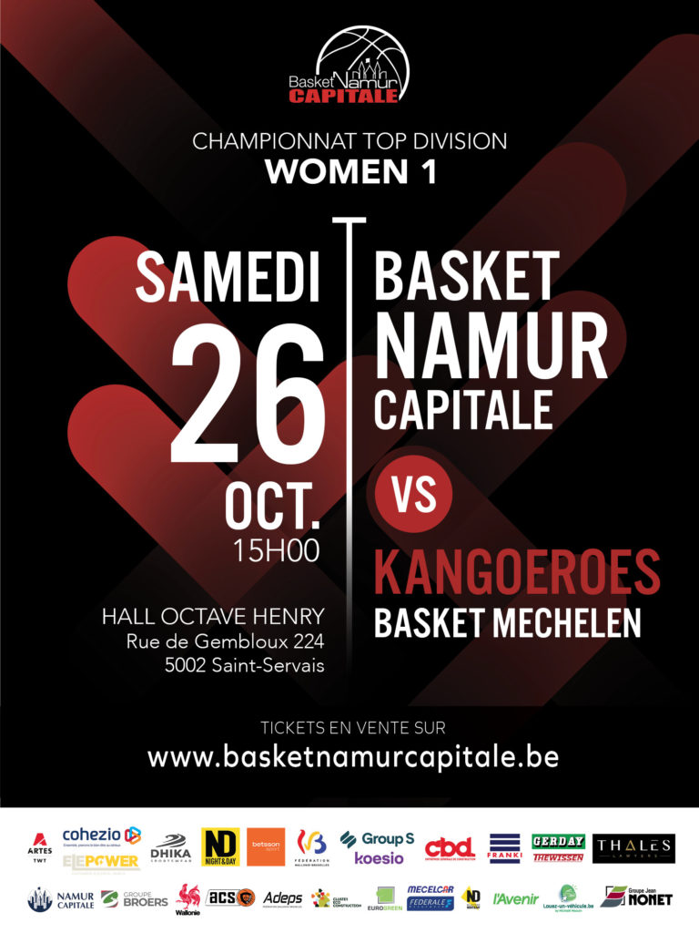 Le dimanche 26 octobre à 15h00, le BASKET NAMUR CAPITALE reçoit KANGOEROES BASKET MECHELEN au Hall Octave Henry.
